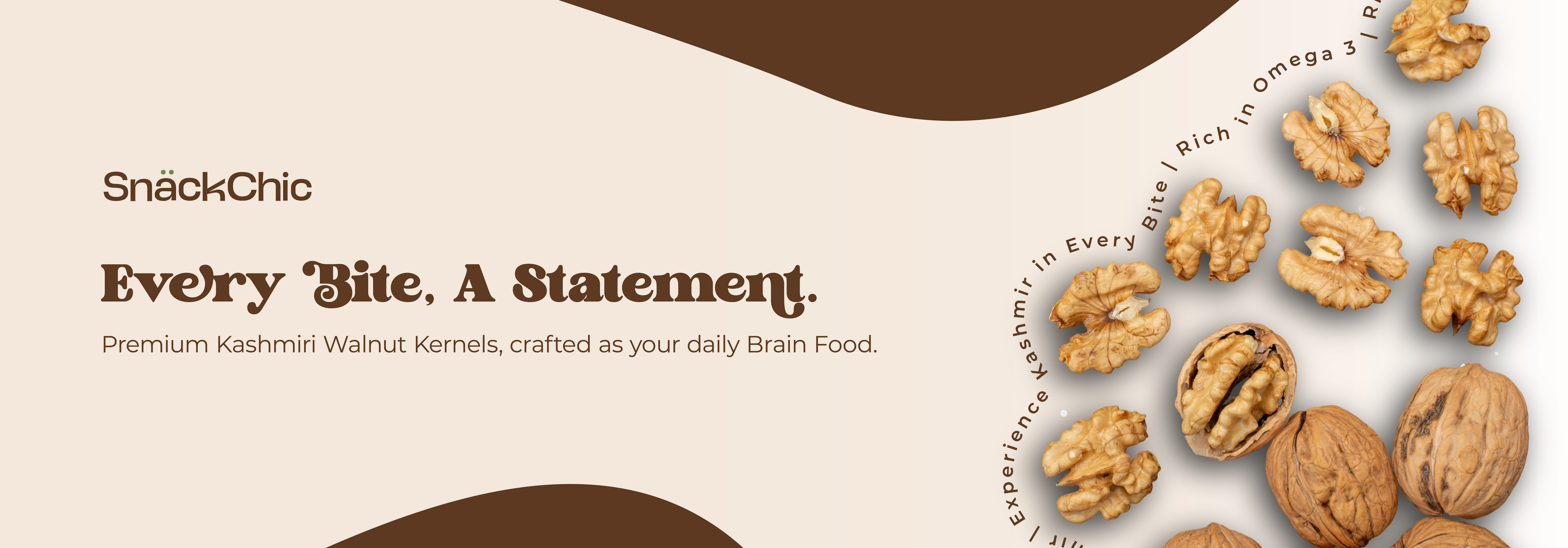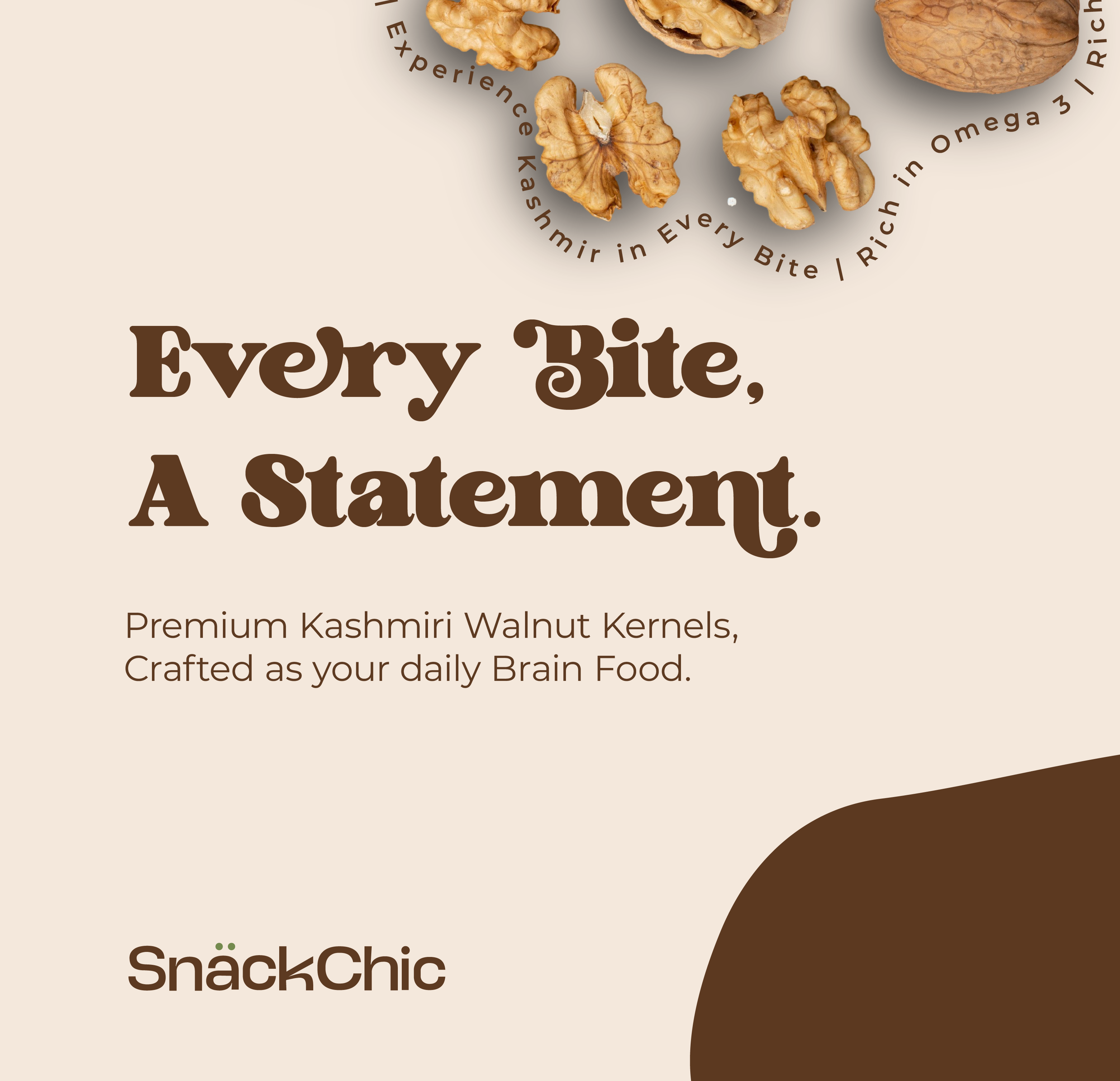 At SnäckChic, we believe snacking should fuel both your ambition and your well-being. Our Premium Kashmiri Walnut Kernels are handpicked, rich in Omega-3, and crafted for discerning professionals who demand both taste and performance. Because your body and mind deserve nothing less than premium.